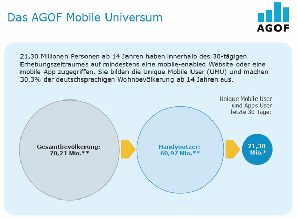 Mobile in Deutschland weiter auf Wachstumskurs: Mittlerweile nutzen 30,3 Prozent der deutschen Wohnbevölkerung ab 14 Jahren das Mobile Web, so die Studie “mobile facts 2012-II” der Arbeitsgemeinschaft Online Forschung e.V. (AGOF). Insgesamt gehen nun schon 21,3 Mio Menschen in Deutschland mindestens einmal im Monat ins mobile Internet. Die tatsächlichen Zahlen könnten sogar noch höher sein, denn die AGOF erfasst derzeit nur 72 mobil-optimierte Angebote und 102 mobile Applikationen von 14 Vermarktern aus dem digitalen Markt – darunter fehlen aber Mobile-Schwergewichte wie Facebook. Mit Yahoo! Deutschland und der eBay Advertising Group kann die Sektion Mobile der AGOF aber nun zwei wichtige neue Mitglieder vorzeigen. Bei den Vermarktern führt G+J EMS mit 10,1 Mio Mobile Usern pro Monat (47,4 Prozent Reichweite) vor InteractiveMedia mit 8 Mio (37,6 Prozent) und Axel Springer Media Impact mit 6,5 Mio Mobile Usern (30,0 Prozent). Allerdings muss die zweitplatzierte Telekom-Tochter InteractiveMedia nun einen kleinen Rückschlag verdauen: United Internet Media will die mobilen Angebote von Web.de (2,89 Mio Unique Mobile User pro Monat) GMX (2,64 Mio) künftig wieder selbst vermarkten. “Mobile wird 2013 eine wichtige Rolle in der Vermarktungsstrategie von United Internet Media spielen. Die Nutzung des mobilen Internets weist ein ungebrochen dynamisches Wachstum auf. Gleichzeitig wachsen das klassische, stationäre und das mobile Internet technisch und in der Nutzung immer weiter zusammen”, erklärt Matthias Ehrlich, Vorstand United Internet Media AG. Daher sei es ein logischer Schritt, dass United Internet Media auf die sich verändernden Mediaanforderungen mit einem integrierten, digitalen Mediaangebot aus einer Vermarkterhand reagiere, so Ehrlich weiter.