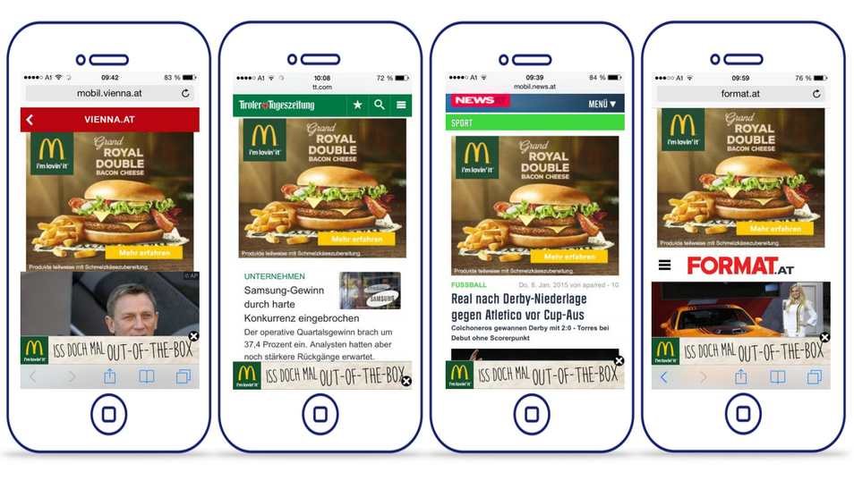 Burger als Klickgarant? Mobile Werbung kann auch innovativ sein! Glauben Sie nicht? Wir zeigen in unser Rubrik “Ad of the Week” regelmäßig spannende Werbekampagnen. Die Mobile-Agentur YOC hat gemeinsam mit der Mediaagentur OmnicomMediaGroup eine mobile Werbekampagne für McDonald’s Österreich entwickelt und eigenen Angaben zufolge eine Klickrate von 4 Prozent erreicht. Die Kampagne wird seit Januar für sechs Wochen auf diversen mobilen Webseiten aus dem Publisher-Netzwerk von YOC ausgespielt und zielt auf einen starken Branding-Effekt ab. Im Rahmen der Kampagne werden neue Burger (z.B. der Grand Royal) beworben und zwei Werbeformate in Kombination in diversen auf diversen News- und Business-Webseiten ausgespielt: Ein fast vollflächiges Medium-Banner (Medium Rectangle 300 x 250) und eine sogenannte Sticky-Ad (320 x 50). Das Medium Rectangle wird zwischen dem Content im sichtbaren Bereich der Webseite dargestellt. Wenn der Nutzer runterscrollt, verschwindet das Medium Rectangle aus dem sichtbaren Bereich und der Sticky-Banner wird dauerhaft im unteren sichtbaren Bereich angezeigt, beinhaltet einen Call2Action und kann per Close-Button geschlossen werden. Das klingt zunächst nicht außergewöhnlich innovativ, garantiert aber eine fast vollflächige Werbedarstellung mit dem Ziel, die Markenbekanntheit zu steigern. Die Kampagne beweist immerhin, dass man das Rad nicht komplett neu erfinden und Banner-Werbung nicht zwangsläufig nerven muss.