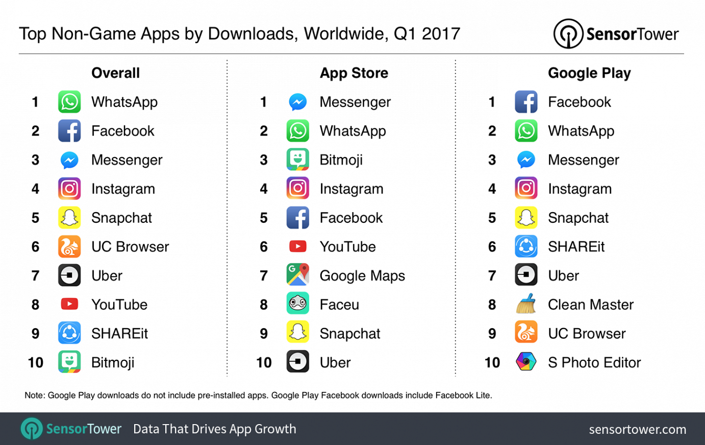 Insgesamt betrachtet hat es bei den App-Downloads Anfang 2017 im Vergleich zum selben Zeitraum im Vorjahr eine Steigerung von etwa 14 Prozent gegeben. Die ersten vier Plätze belegt dabei Facebook. Der zum sozialen Netzwerk gehörende Nachrichtendienst Whatsapp ist die weltweit am häufigsten heruntergeladenen App. Ende 2016 war der Dienst im Ranking auf Platz vier gerutscht. Auf Platz zwei, drei und vier stehen mit der Facebook-App, dem Facebook-Messenger und Instagram ebenfalls Anwendungen aus dem Hause Zuckerberg.
