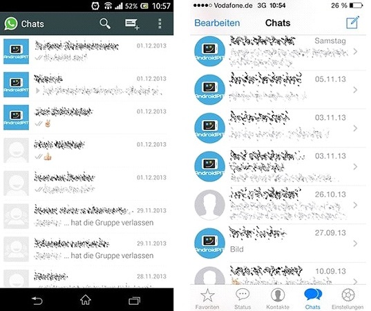 Allgemein gilt: Weniger ist mehr! Über einfache Reize und ein dezentes Design freut sich der User. Zu viele Features mit unübersichtlicher Darstellung, sind ein No-Go für eine neu entwickelte App. Die App wirkt überladen und die Bedienung leidet darunter. Beispiele aus der Praxis sind die Unterschiede zwischen Android und Apple Smartphones. Während beispielsweise der „Zurück“-Button beim iPhone häufig oben links in der Ecke liegt, benötigen Android Smartphones den Button in der Regel nicht, da der Button häufig unter dem Bildschirm liegt. Ein beeindruckendes Beispiel für die Unterschiede zwischen Android und Apple ist Whatsapp, wie im folgenden Bild dargestellt. Die Anordnung der Navigationselemente spielt eine entscheidende Rolle für die Usability der App.