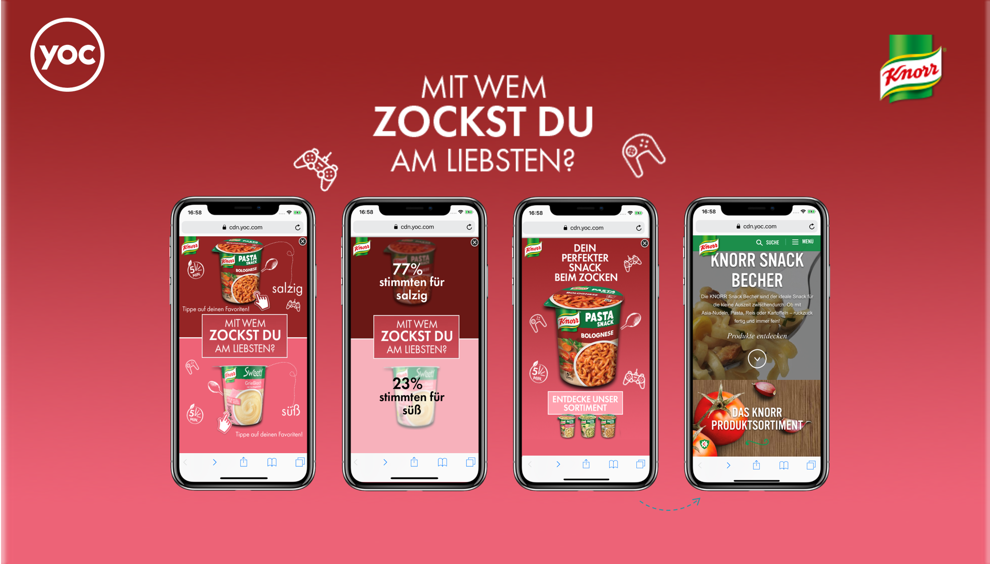 Der Mobile-Werbespezialist YOC bietet mit dem neuen Werbeformat Live Poll Ad die Möglichkeit, Nutzer direkt und aktiv einzubinden. Durch eine „Live-Abstimmung“ innerhalb des Werbemittels wird vor allem auf Interaktivität und persönliche Ansprache des Nutzers gesetzt, um ein überdurchschnittliches Engagement zu erreichen. Erster Kunde ist Unilever, das gemeinsam mit der Agentur Mindshare und YOC die Kampagne “Knorr Snacking” umsetzt.